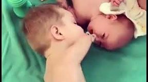 Малыш без рук дает пустышку ребенку, до слез